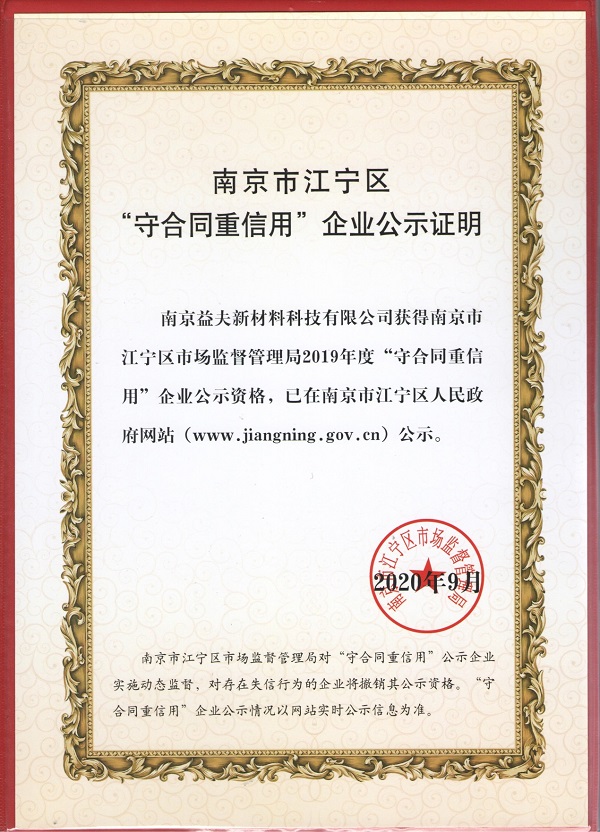 2020年9月我司榮獲南京市江寧區(qū)“守合同重信用”企業(yè)稱號,這也是符合我司經營理念的,我司一再堅持,任何銷售形式都要以有合同為前提,嚴格按照合同內容規(guī)范執(zhí)行。合同,是受國家商法規(guī)范的可執(zhí)行法律。信用,是社會良知的基礎。是現(xiàn)代發(fā)達國家一切的人類人民人們生活的所有基點和基礎。南京益夫會堅持守合同重信用,為建材行業(yè)交易市場的有序健康發(fā)展沖鋒打頭陣。